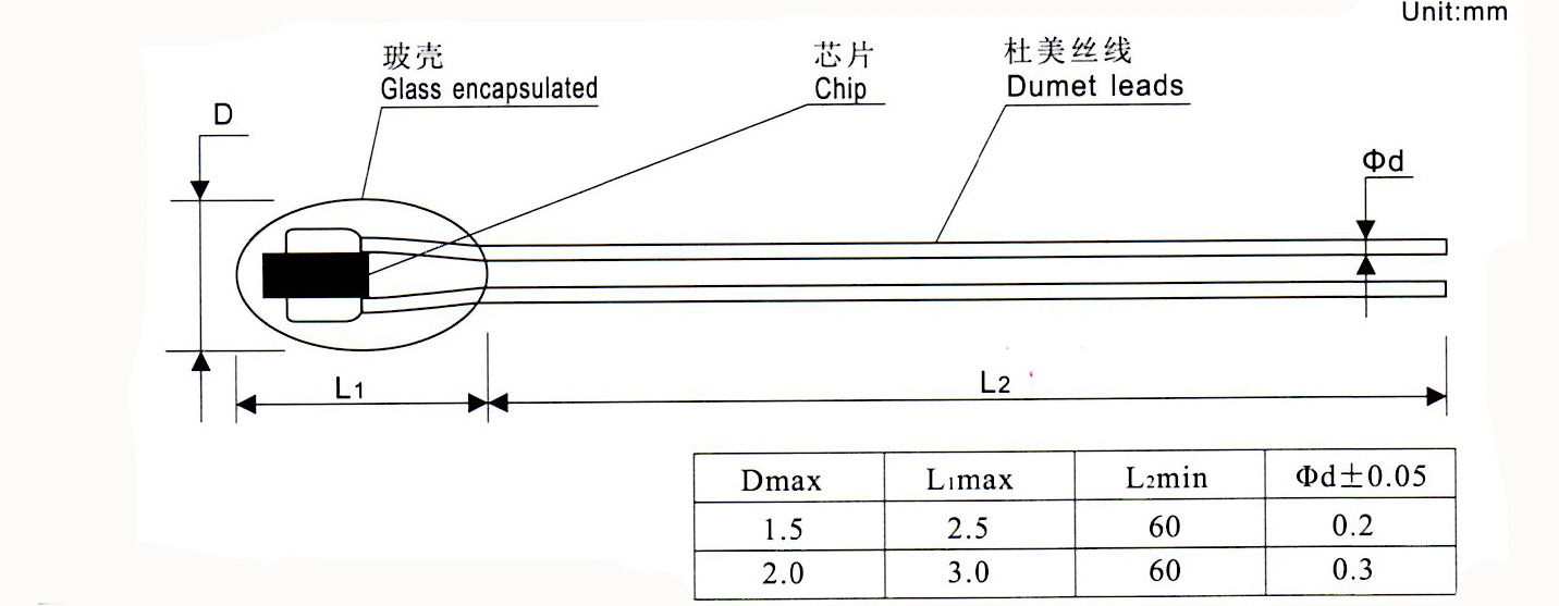 MF58D玻璃封裝NTC熱(rè)敏電(diàn)阻尺寸(單位:mm)